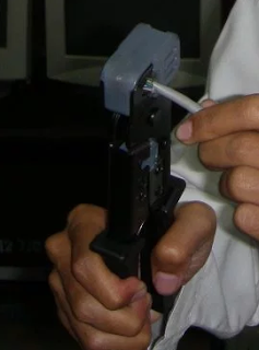 Langkah selanjutnya masukkan konektor RJ-45 yang sudah terpasangi kabel UTP tadi ke salah satu mulut tang crimping yang memiliki bentuk dan ukuran cocok dengan konektor RJ-45. Tekan bagian pangkal konektor dengan tang krimping. Penekanan ini akan membuat pin-pin yang ada di ujung konektor menancap di masing-masing kabel.