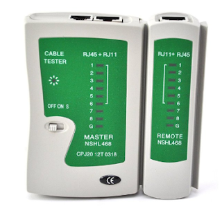 kemudian uji dengan kabel tester. Colokkan salah satu ujung ke induk tester ( yg besar ) ke port Tx. Dan colokkan ujung lain ke anak tester (yg kecil) ke port Rx. Nyalakan kabel tester dengan menggeser saklar ke posisi auto.